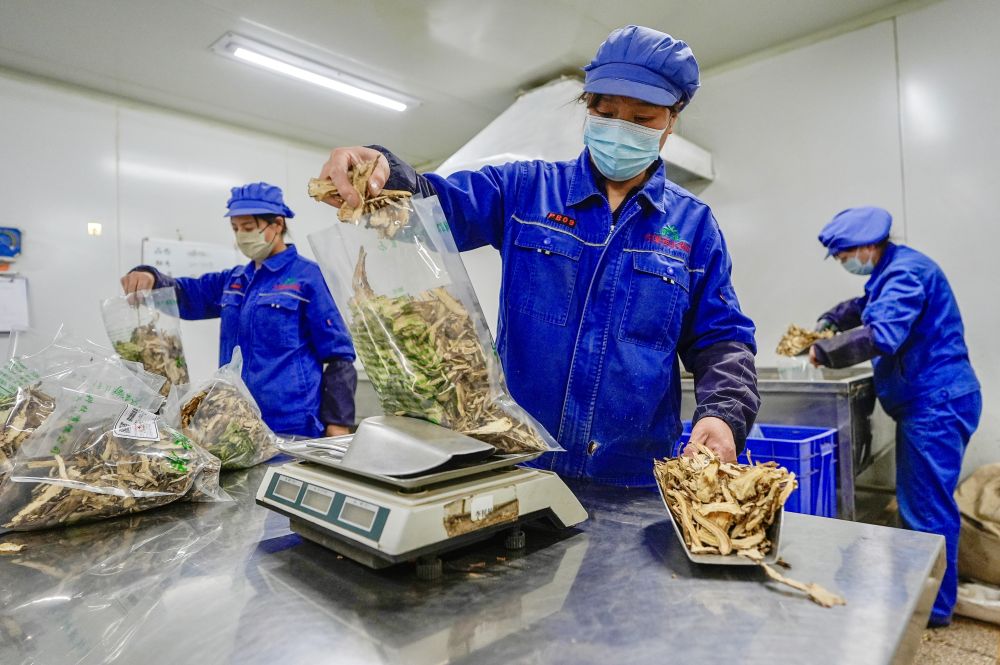 2026年1月26日,工作人员在宁夏固原市隆德县一家药材加工企业分包当归。