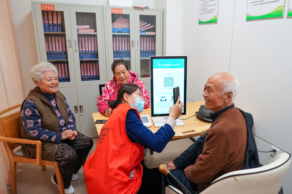 2025年10月23日,老人在山东省淄博市张店区马尚街道金石社区日间护理中心测量健康数据。