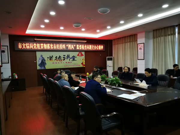 2月24日上午,市文化市场综合执法局召开党组(扩大)会,研究落实市纪委2018年春节期间纠“四风”监督检查问题交办会精神。会议由市文化市场综合执法局党组书记、局长伍作春主持,市纪委派驻市委宣传部纪检组组长刘于春到会指导,局党组成员及全体科室负责人参加了会议。各党组成员结合自己分管的工作就如何整改问题作了表态发言。