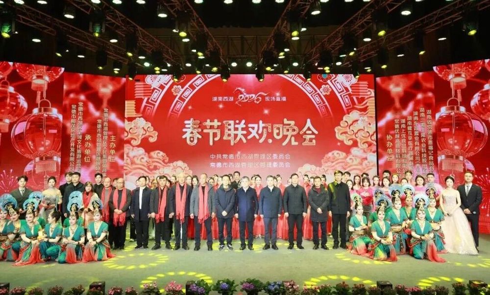 晚会伊始,现场依次播放承办、协办单位企业宣传片,西湖龙庭、常德优耐高新材料有限公司等一众西湖本土企业精彩亮相,生动展现出本土企业扎根西湖、深耕发展的奋进风采与助力区域经济社会建设的责任担当。春晚宣传片《启航“十五五”・奋进新征程》全景展现2025年西湖管理区发展成果,凝聚全区上下同心奋进、勇毅前行的磅礴力量,为整场晚会拉开温馨而热烈的序幕。