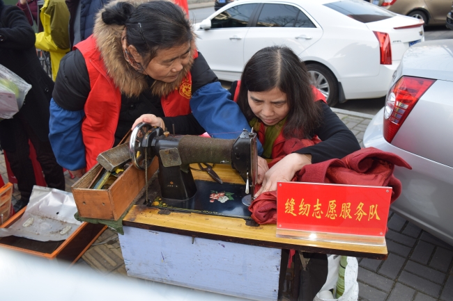 市文体广新局调研员邱诺亚为光荣路社区居民义务缝纫