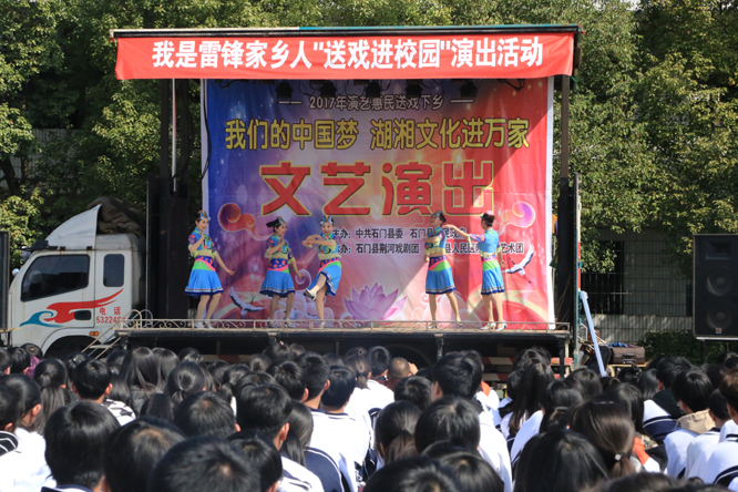 3月2日上午,石门县文体广新局组织县荆河戏剧团、执法大队30多名文化志愿者走进易家渡镇瑜远中学,下午又组织石门县文化馆10多名文化志愿者来到新关镇长岭村,拉开了“我是雷锋家乡人·湖湘文化送春风”文化志愿服务系列活动的序幕。志愿者们以送文艺、送法到基层的方式,弘扬雷锋精神,传播湖湘文化。现场悬挂“我是雷锋家乡人,湖湘文化送春风”的条幅,高举“石门县文化志愿服务支队”的旗帜,所有志愿者穿着志愿服、佩戴“中国文化志愿者”徽章,满腔热情投入活动,在阳春三月掀起了一股文艺新风。