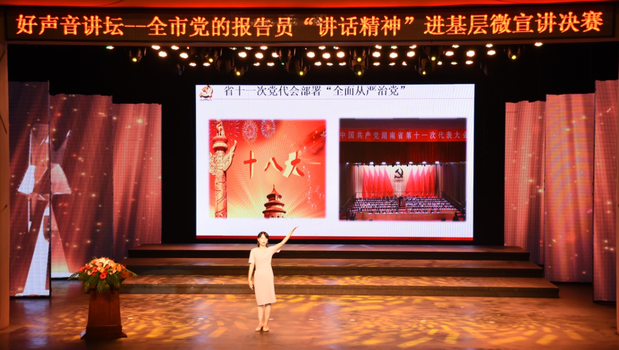 6月27日下午,由常德市委宣传部主办的好声音讲坛——全市党的报告员“讲话精神”进基层微宣讲决赛及颁奖在常德市文化馆举行。经过各县(市、区)和各部门的推荐、专家评审,最终10名选手来到决赛的舞台。