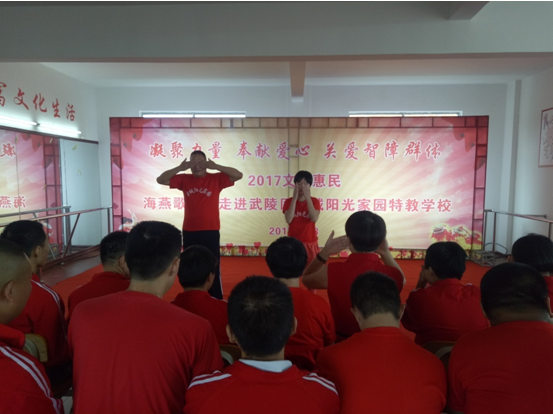 9月28日上午,海燕歌舞团文化惠民关爱智障群体走进武陵区东城阳光家园特教学校进行慰问演出,为现场30名智障人士送去精彩的节目表演。在中秋国庆双节来临之际,对智障人士表示关怀,唤起社会对智障群体的关注和关爱。