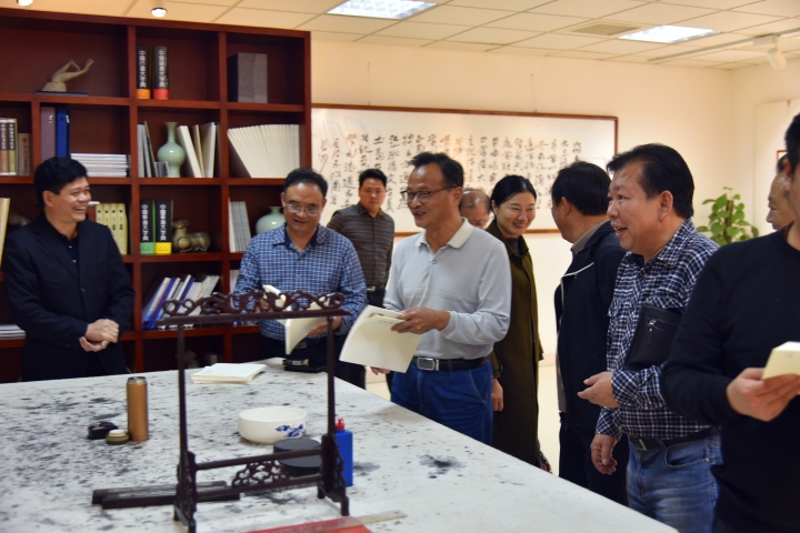 11月1日下午,湘西自治州文联主席黄叶带队到市文化馆参观考察,黄叶一行参观了常德市文化馆张锡良书法工作室、美术书法摄影展厅,湖南省人大常委会委员、省人大法制委员会副主任委员曹儒国, 常德市文联主席王军杰,文联副主席、市文化馆馆长袁学明等陪同。