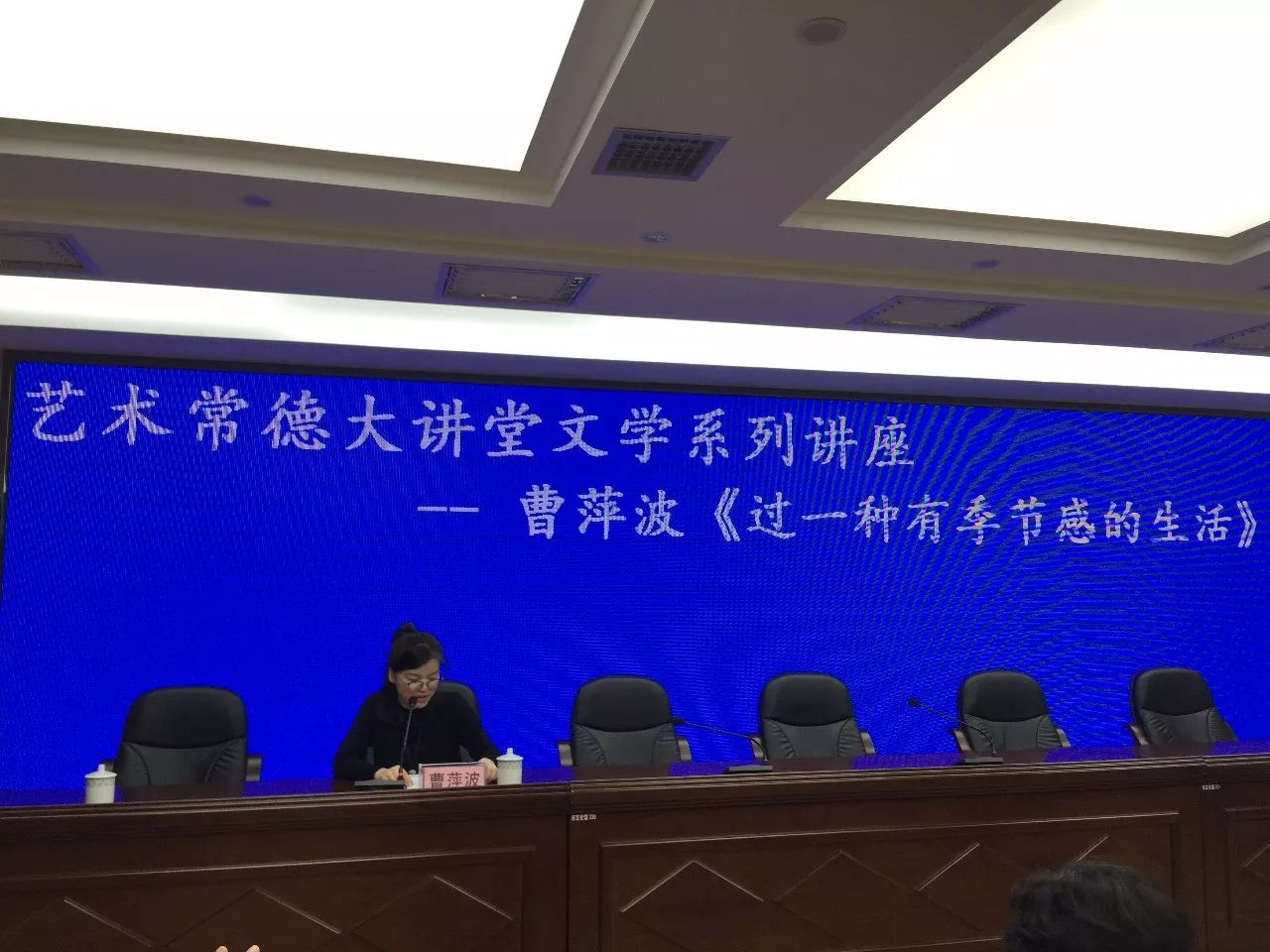 11月4日上午9点,90后著名青年作家曹萍波就其散文代表作《万物赠我浓情蜜意》,进行了题为《过一种有季节感的生活》的讲座。曹萍波笔名手工小姐,现为供职于湖南卫视,发表散文作品几十万字,在《三联生活周刊》开有专栏“物候志”,引起强烈反响,著有散文集《时间的模样》、《万物赠我浓情蜜意》等。在讲座中,曹萍波通过分享生活中的三个故事,追溯了她的创作背景,她强调精神寄托对生活的重要性,并倡导大家要勤于观察生活细节,并通过积累素材来促成写作的灵感。