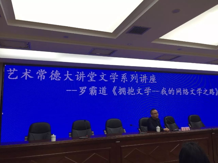 11月4日下午2点,中国作协会员、知名网络作家罗霸道进行了题为《拥抱文学——我的网络文学之路》的讲座。罗霸道原名罗业勇,湖南常德市人,2007年成为网络写手,原起点中文网白金作家,后在纵横中文网,现为阿里巴巴文学网站签约作家,著有《霸道人生》、《屠神之路》、《星际江湖》等作品,现为湖南省网络作家协会副主席。罗霸道在讲座中贯穿了自身对网络文学的认知观,并与现场观众就网络文学中的精华与糟粕议题进行了精彩的交流。