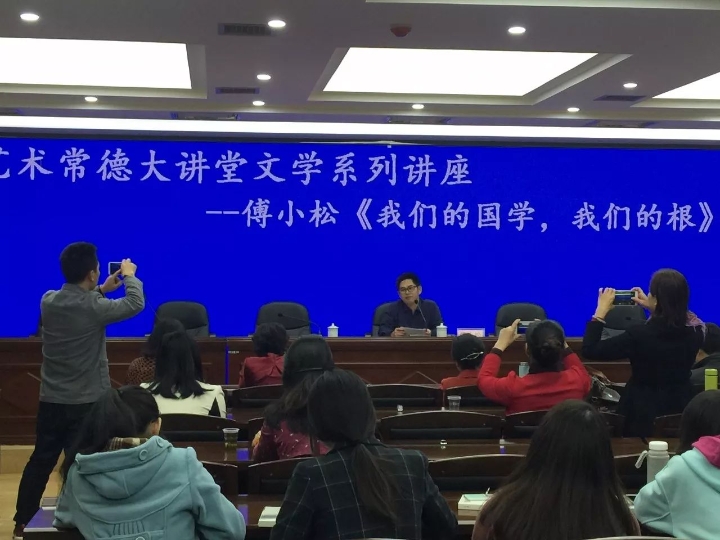11月5日下午2点,中国楹联学界专家傅小松围绕《我们的国学,我们的根》进行了精彩演讲。傅小松现任民盟湖南省委委员、办公室主任,系中国楹联学会理事、中国毛泽东诗词研究会常务理事、湖南省楹联家协会秘书长、《对联学刊》执行主编,为“湖湘楹联七子”之一。傅小松通过什么是中国的传统文化、中国传统文化的三大智慧以及中国传统的文化的局限性为线索,着重梳理了阴阳两元、天人合一及大道至简的国学理论,客观公正地概述国学对国人哲学观及写作观的影响,引发现场观众的激烈讨论。
