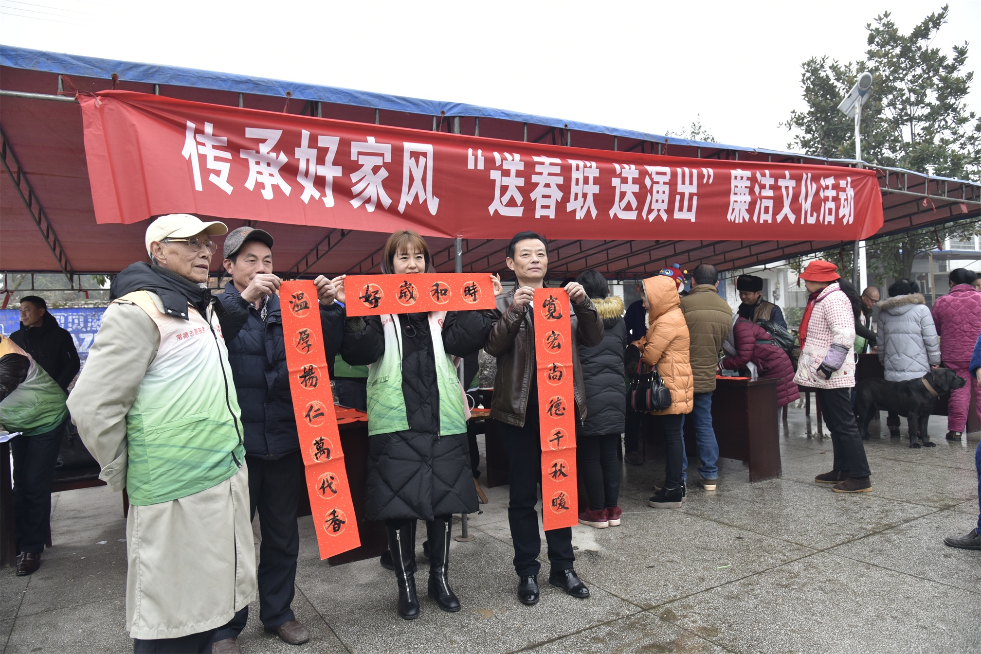 中午1时许,洋淘湖镇中心广场上,“我们的中国梦·湖湘文化进万家”常德市文化馆办团队惠民演出与“传承好家风·送春联送演出廉洁文化活动”同时开始。书法家们现场挥毫泼墨,“家藏万贯休放纵,书溢千香可耐贫” 、“礼义传家为教道,诗书养性继高风”、“腾地绍芳千枝茂,前人誓训百世传”、“宽宏尚德千秋暖,温厚扬仁万代香”…伴着浓浓的墨香,一副副传扬家风家训与廉洁文化的大红春联就展现在人们眼前。基层干部群众喜笑颜开,争相挑选着自己喜欢的春联,互相传达着新春祝福。舞台上,歌曲演唱《祖国万岁》、《儿行千里》,舞蹈《绒花》《红红的中国》、京剧《祖国的好山河寸土不让》等节目为观众讲述着一个个动人的中国故事,传承着中华优秀传统文化。文艺工作者和文化志愿者们奏响了社会主义核心价值观主旋律,传递着崇德向善、奋发向前的良好风尚。
