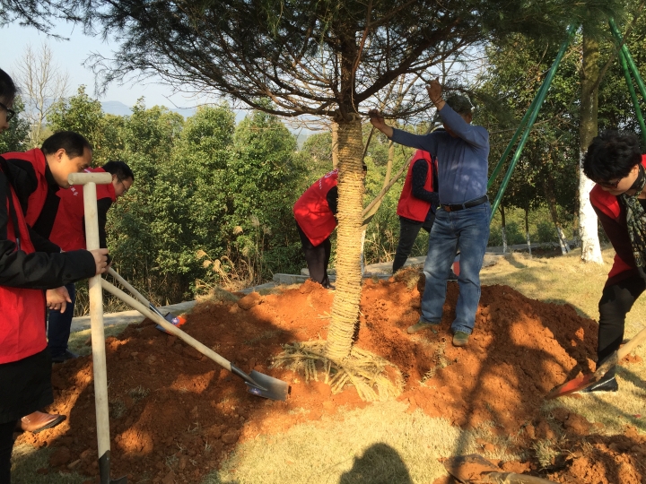 活动现场,文化志愿者们在林伯渠铜像广场后山坡指定位置挖坑铲土、栽种树苗、培土浇水,将一棵棵树苗栽入泥土中。移栽的大口径树木,早已准好了粗绳子,三人一组,五人一群,将树木牵引拉入土坑,扶直、摆正、填土、夯基,一个个动作似乎那么专业,既分工又合作,齐心协力栽植一棵又一棵树木。经过半天的时间,大家很快完成了50小雪松棵的培土浇水和8棵大雪松的栽植工作,再次为故居景区增添了新绿。