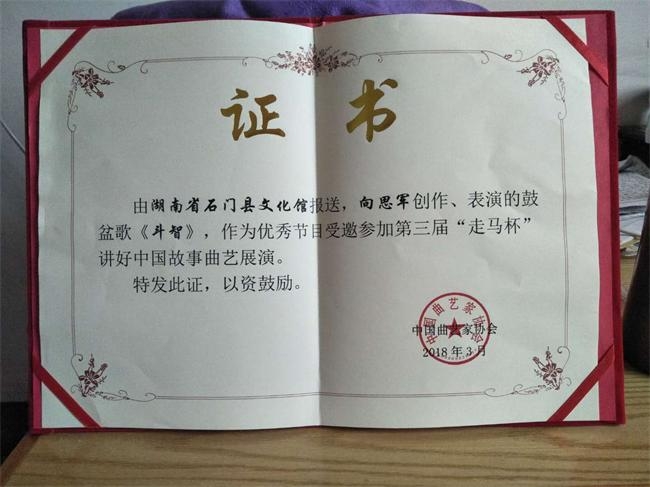 由石门县文化馆选送,湖南曲协推荐,向思军表演的大鼓《斗智》得到了中国曲协专家的一致好评,表演一结束,全场响起了雷鸣般的掌声,中国曲艺家协会副主席张旭东针对这个节目点评到:“来自湖南的向思军老师用鼓盆歌这一古老的曲艺艺术形式讲述了经典的三国故事,曲调唱得非常好,故事情节精彩,我非常喜欢这个节目,为你点赞”,展演结束后,张旭东老师和向思军进行了进一步的交流和探讨,并对他今后的舞台上表演的技巧和方法进行了指导。