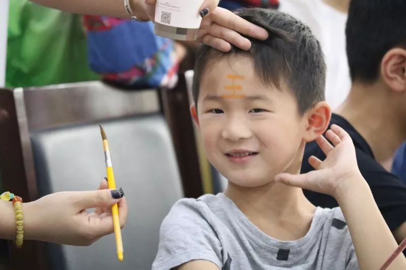 工作人员为小朋友画额,用雄黄酒写上“王”字,寓意着病魔都远走。