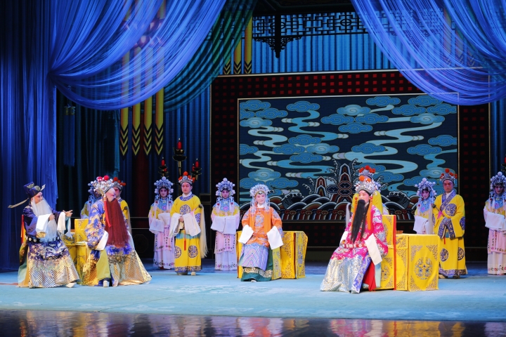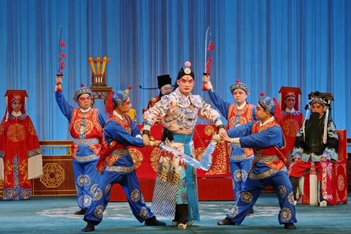 《刘备招亲·甘露寺》剧照,袁金霞饰刘备(右)、陶晓玲饰乔阁老(中)、李锐饰乔玄(左)、谢文革饰孙权(左二)
