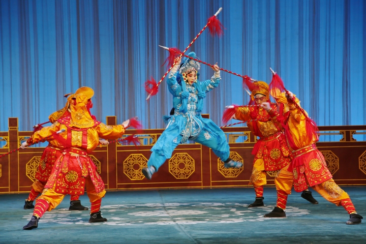 “打”——伍欢表演的“打出手”是戏曲传统打戏的高难度程式化动作,它以“下把”抛枪,“上把”居中作抛、掷、踢、接枪的特技表演,加上紧促的出手锣鼓和管弦伴奏,表现了戏曲舞台激烈的打斗场面,深得观众喜爱。