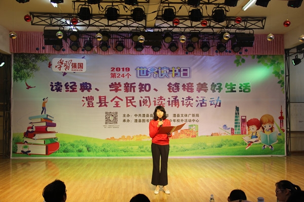 为迎接第24个世界读书日,4月20日,由中共澧县县委宣传部、县文体广新局主办,县图书馆和县青少年校外活动中心承办的“读经典 学新知 链接美好生活”全民阅读诵读活动在县少年宫演播厅进行,县委宣传部副部长熊新华出席并致辞,来自各学校、各单位的200多名诵读爱好者参加活动。