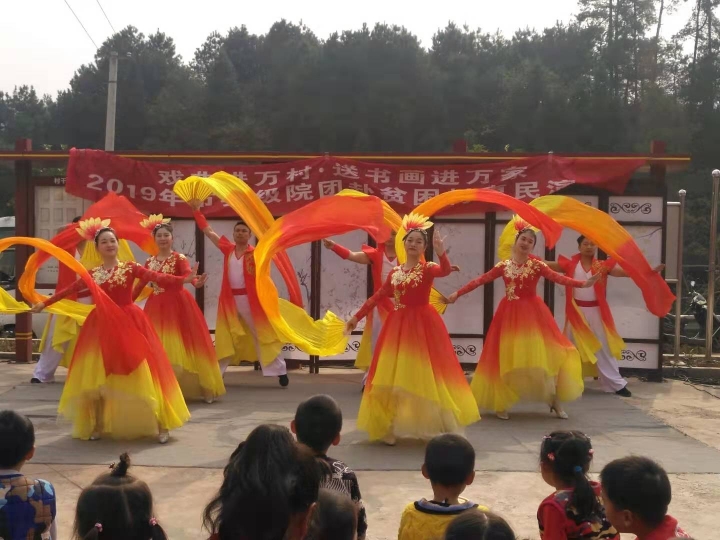 经过四个半小时的车程,一路颠簸,文艺轻骑队抵达目的地,因交通不便,舞台车无法到达该村,只能在村部前坪进行表演。村民们和当地小朋友、学生们提前在现场等候观看。文艺轻骑队表演的戏曲、舞蹈、独唱、乐器独奏等节目深受村民喜爱,当地小朋友表演唱儿歌,村民唱山歌,一起歌颂党恩。情景剧《留住支书》剧中基层干部为村民,送政策、送温暖,热情服务解民困,齐心建设新农村的场景,赢得了村民的阵阵掌声。最后一曲合唱《歌唱祖国》村民热情高涨,在台下一同欢唱。