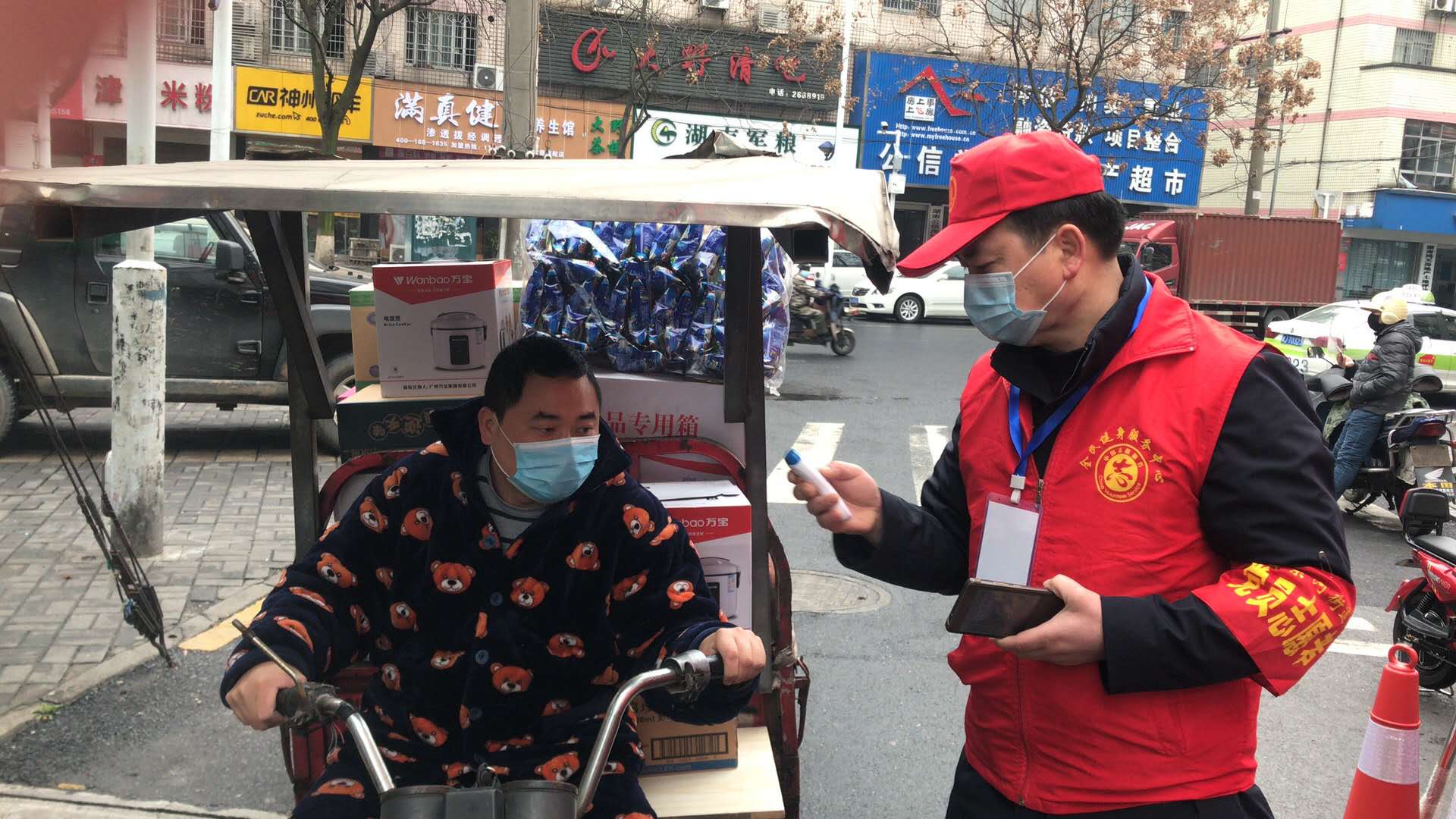 志愿者在防控一线为居民测量体温