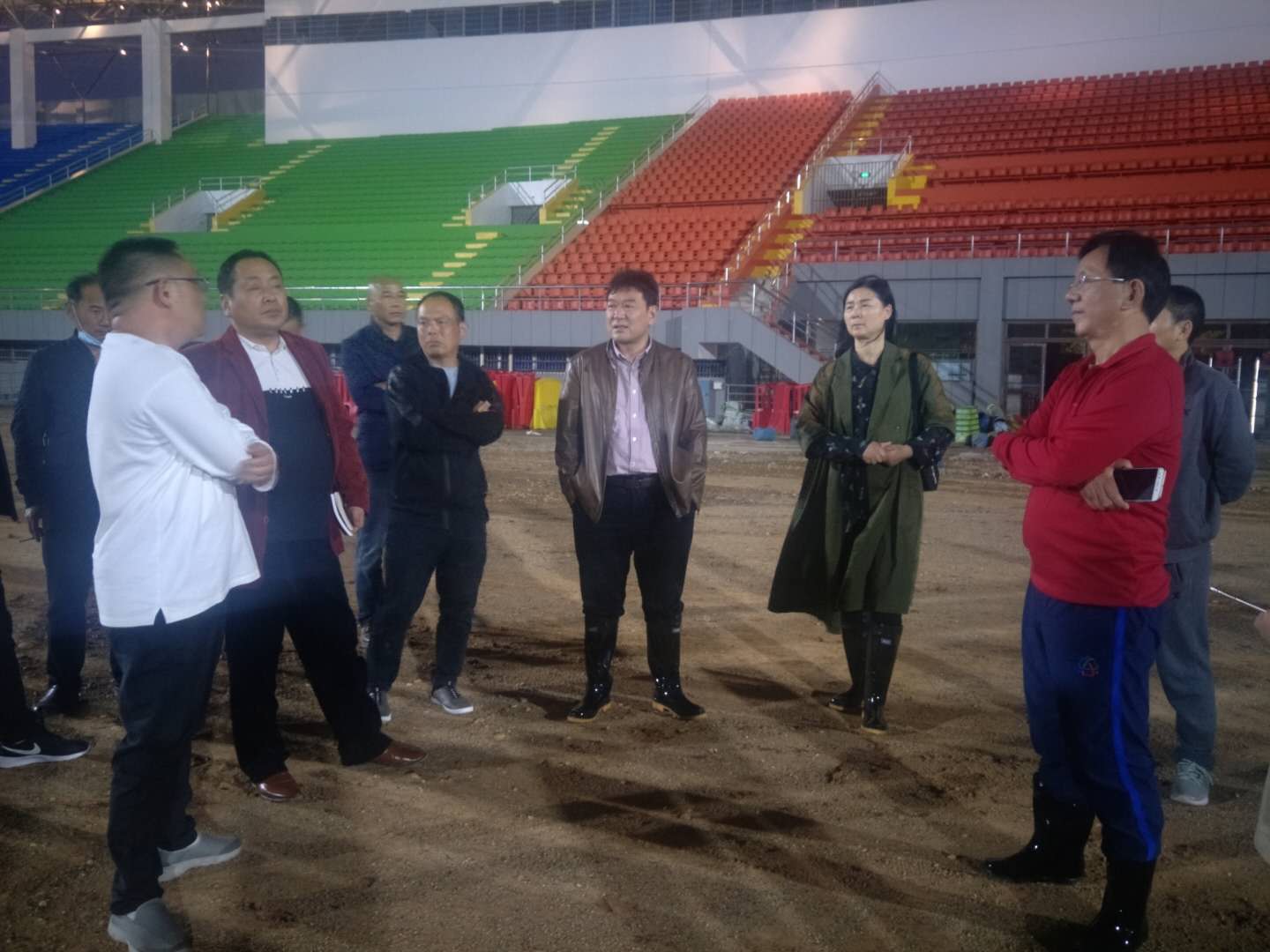 杨俊详细了解了工程施工的进展情况,对场地的排水系统进行了检查,对足球场的夜间灯光照明状况进行了了解和测试。