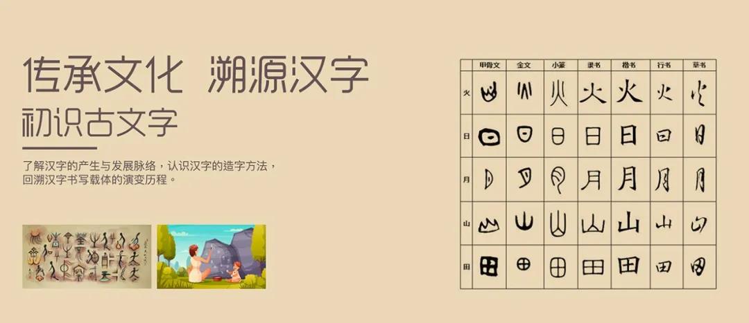 1.历史课堂:《传承文化·溯源汉字——初识古文字》了解汉字的产生与发展脉络,认识汉字的造字方法,回溯汉字书写载体的演变历程。