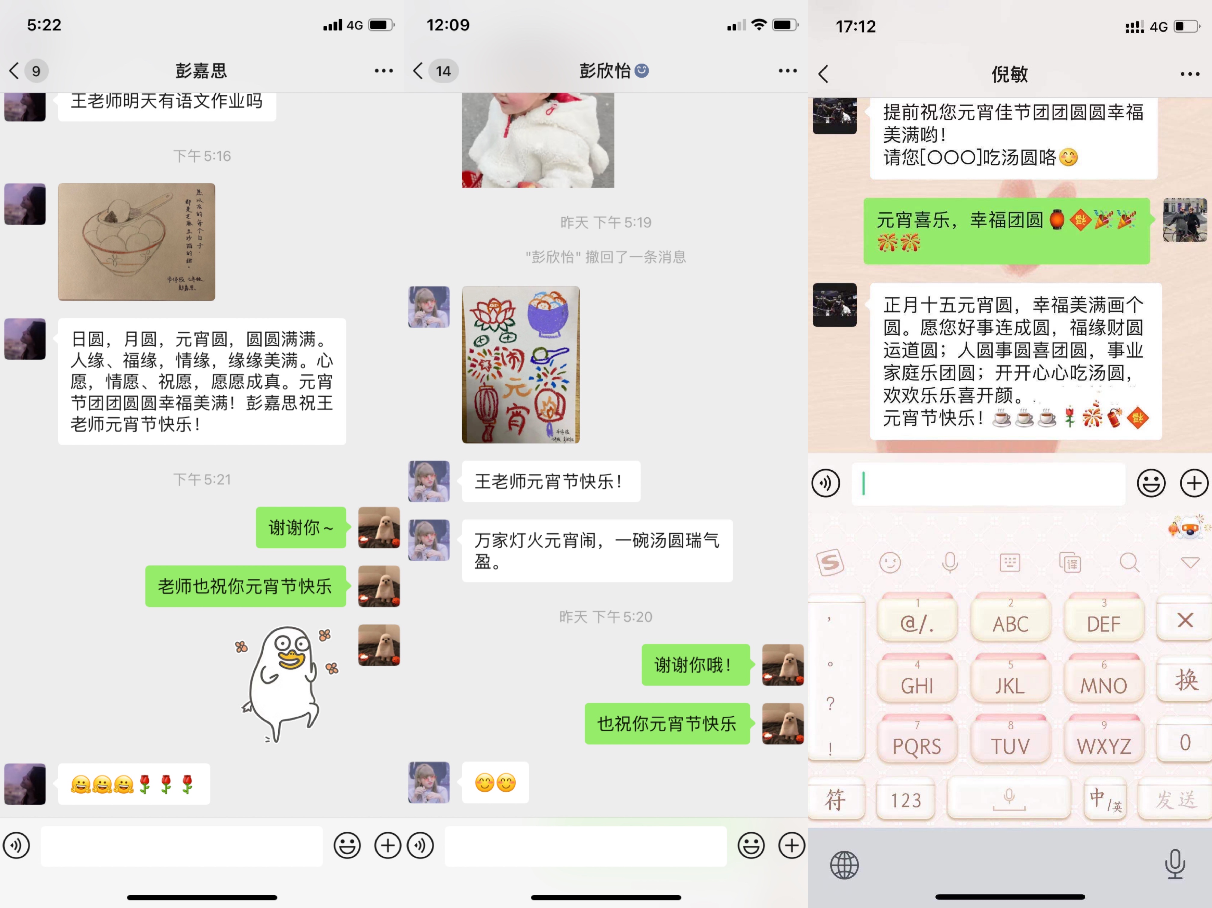 活动在班级群内通知后,常德市体校的同学们绞尽脑汁,使出浑身解数,踊跃参加活动,根据自己的能力为老师们送上了最暖心的祝福。活动的开展,激发了同学们对中国传统文化的热爱之情,有些同学撰写了温馨的祝福,有的同学绘制了精美的画作,还有的同学发挥创意,亲手制作一些维妙维肖、栩栩如生的手工作品,元宵佳节的乐趣也就在这其中了。看着同学们发来的作品,老师们隔着屏幕都感受到了同学们洋溢的青春热情。