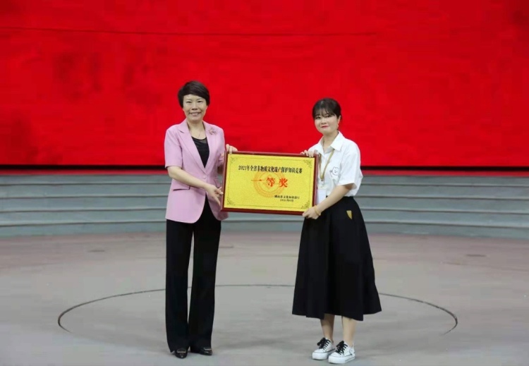 湖南省文化和旅游厅党组成员、副厅长张希慧(左)为获得一等奖的常德市代表队颁奖