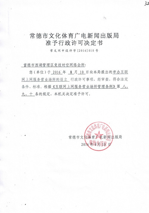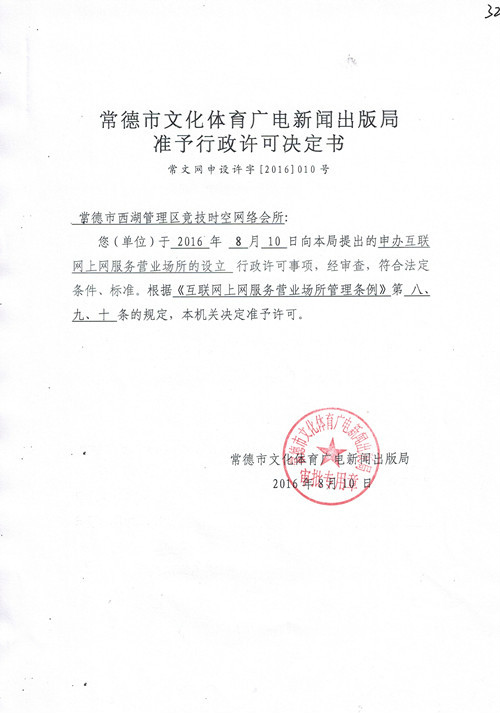 行政许可决定书:常德市西湖管理区竞技时空网络会所