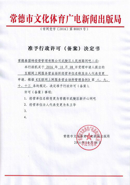行政许可决定书(常德泰茵特投资管理有限公司武陵区人民西路网吧二店变更)