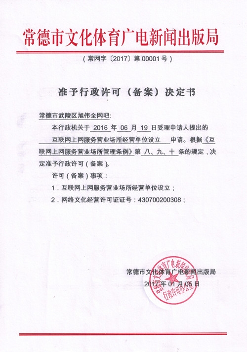 行政许可决定书(常德市武陵区旭伟全网吧)