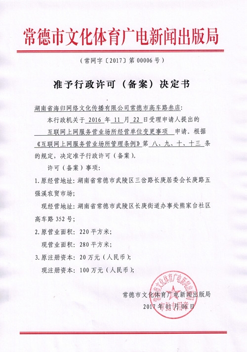 行政许可决定书(湖南省海归网络文化传播有限公司常德市高车路叁店)