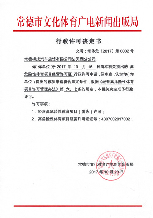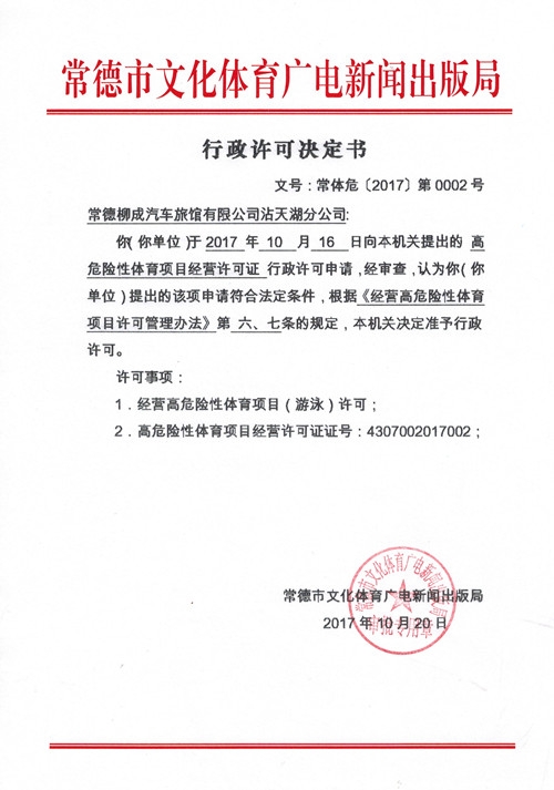 行政许可决定书(常德柳成汽车旅馆有限公司沾天湖分公司)