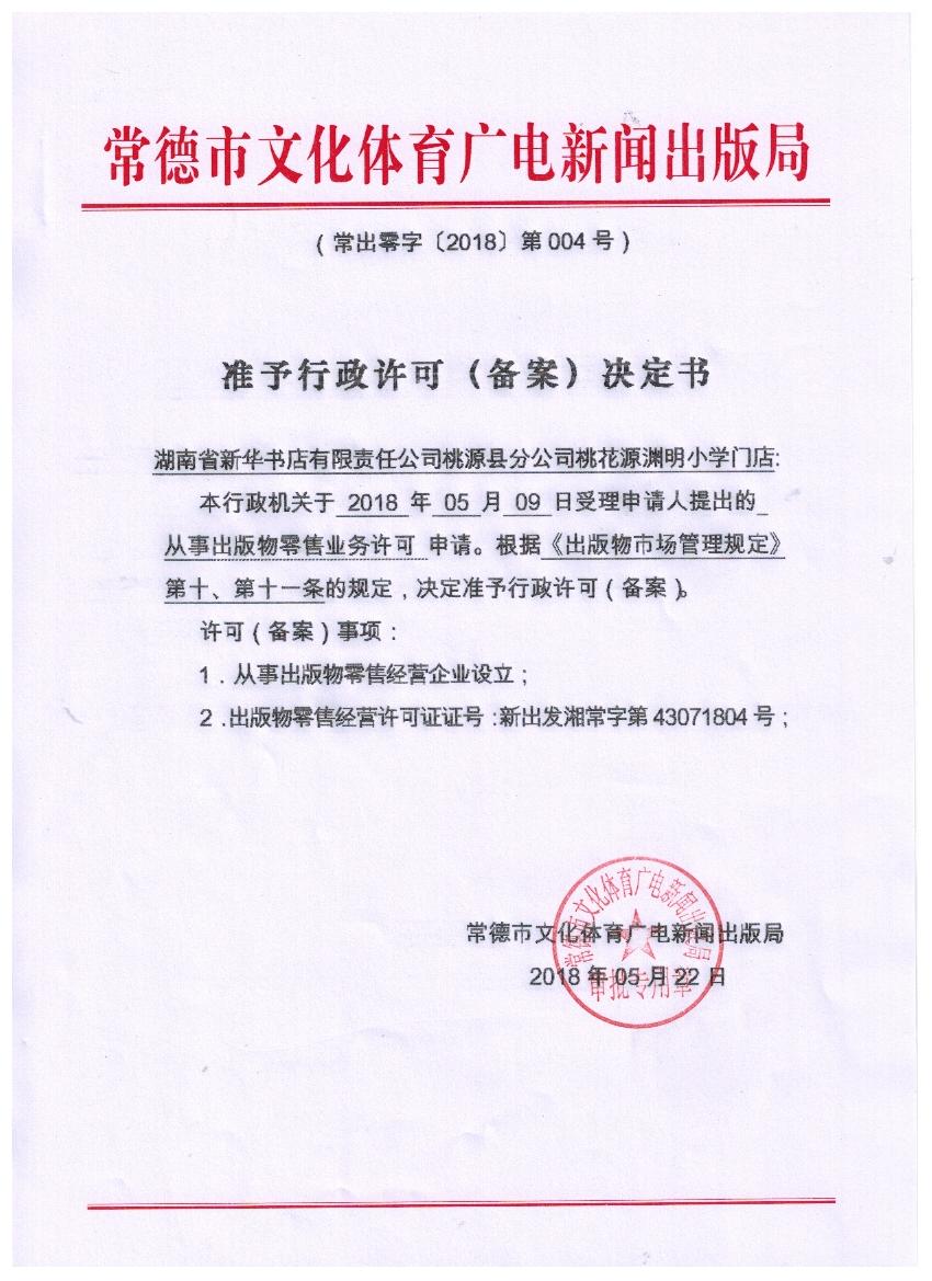 行政许可决定书(湖南省新华书店有限责任公司桃源县分公司桃花源渊明小学门店)