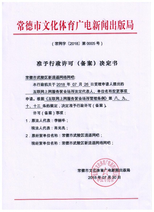 行政许可决定书(常德市武陵区新逍遥网络网吧)