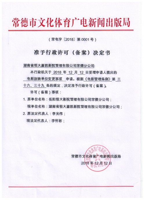 2018年行政许可决定书(湖南省恒大嘉凯影院管理有限公司常德分公司)