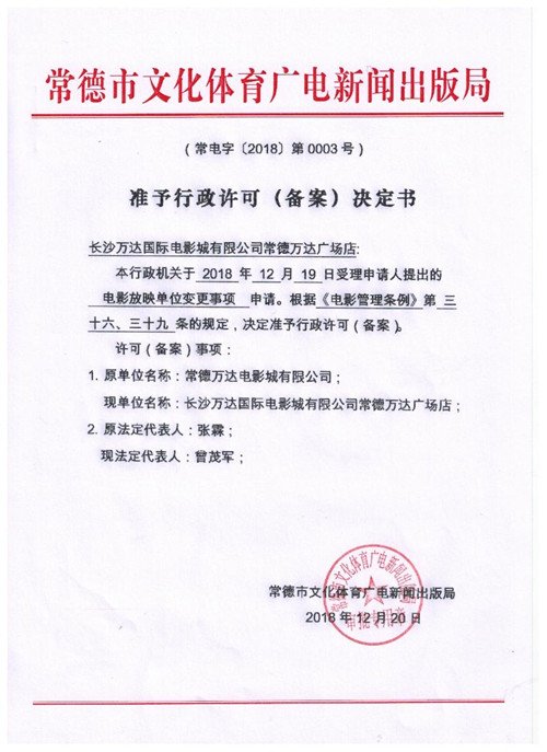 行政许可决定书(长沙万达国际电影城有限公司常德万达广场店)