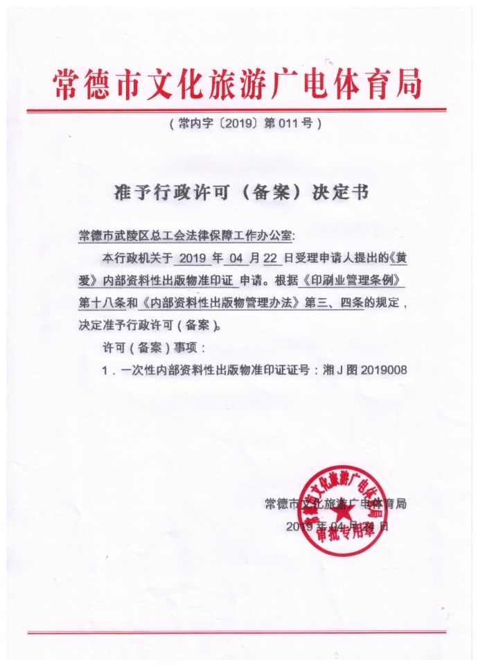 行政许可决定书(常德市武陵区总工会法律保障工作办公室)