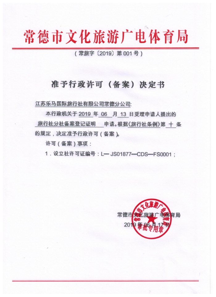 2019年行政许可决定书(江苏乐马国际旅行社有限公司常德分公司)