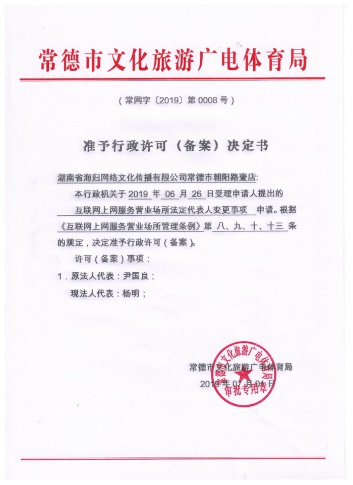 2019年行政许可决定书(湖南省海归网络文化传播有限公司常德市朝阳路壹店)