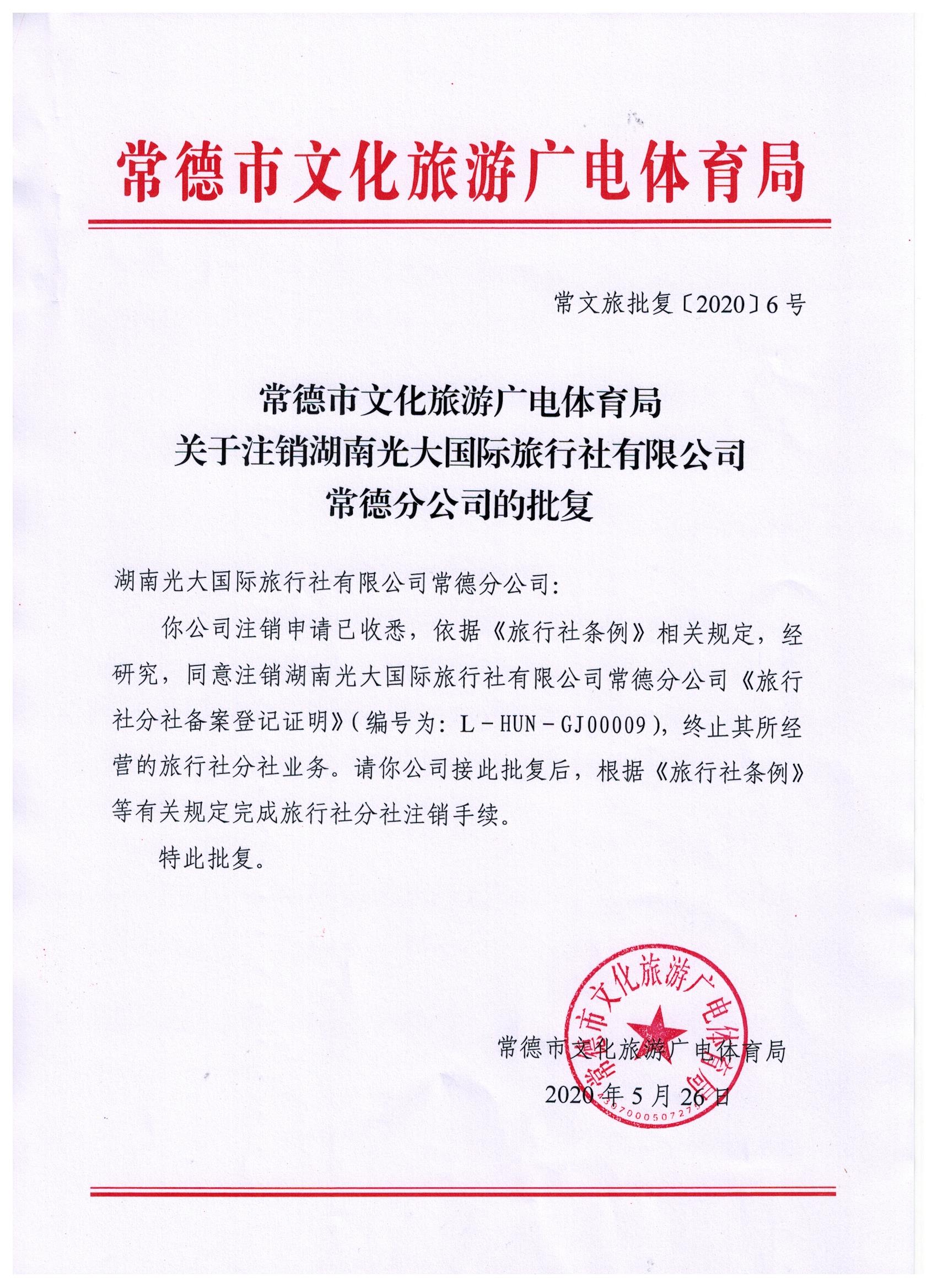 2020年关于注销湖南光大国际旅行社有限公司常德分公司的批复