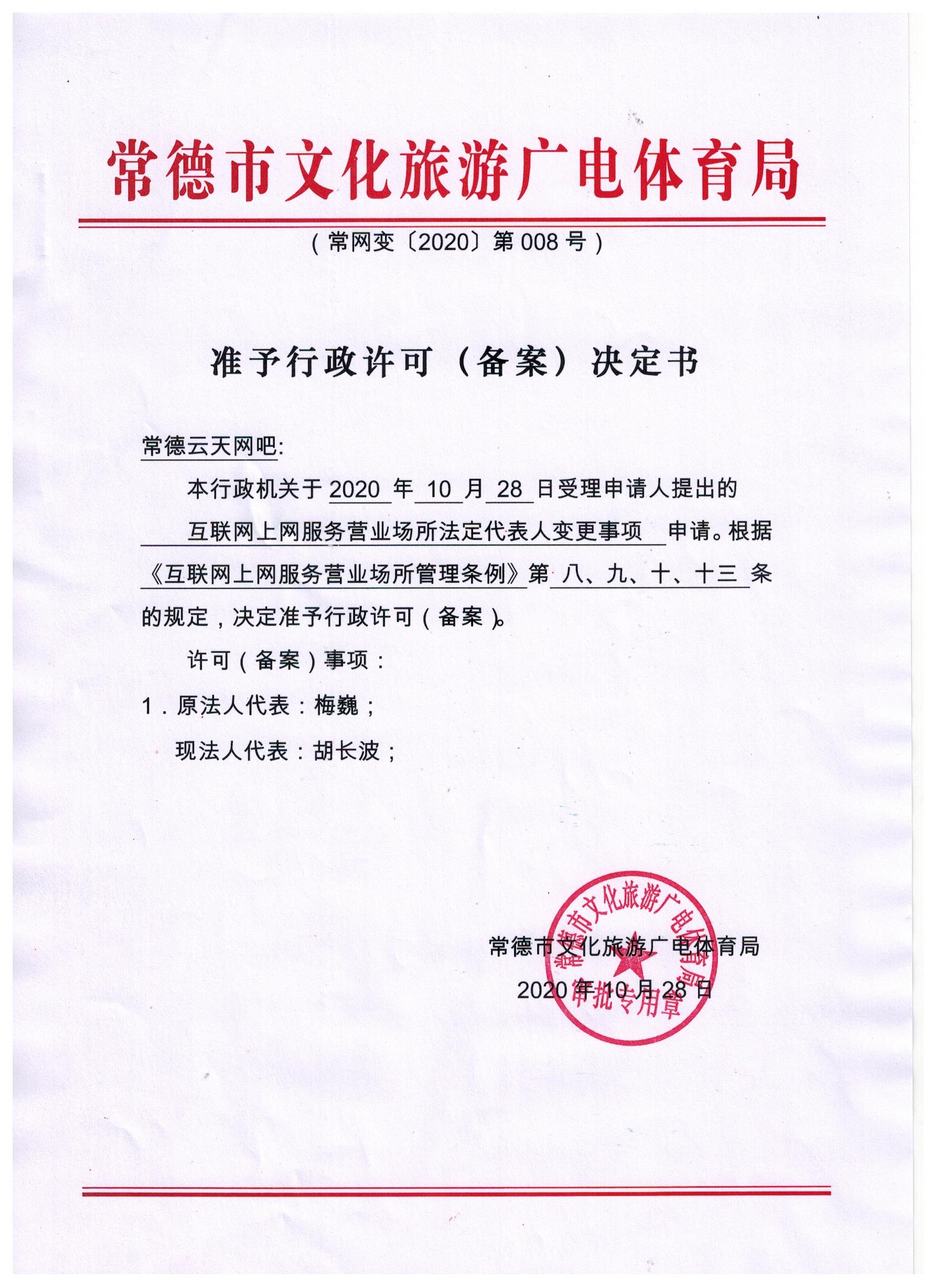 2020年常德市准予行政许可决定书(常德云天网吧)