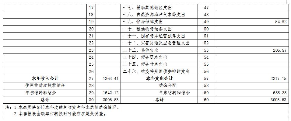 2021年度收入总计3005.53万元。与上年相比,减少1156.53万元,减少27.79%。支出总计3005.53万元。与上年相比,减少1156.53万元,减少27.79%,