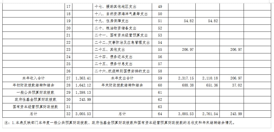 2021年度收入总计3005.53万元。与上年相比,减少1156.53万元,减少27.79%,主要是因为政府性基金预算财政拨款收入减少。支出总计3005.53万元。与上年相比,减少1156.53万元,减少27.79%,主要是因为基本建设类项目支出减少。