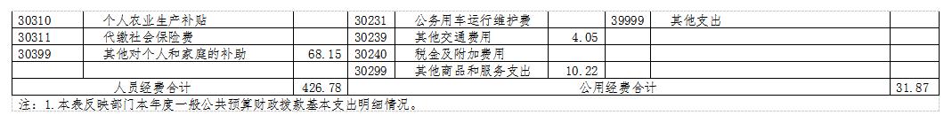 2021年度财政拨款基本支出458.65万元,其中:人员经费426.78万元,占基本支出的93.05%,主要包括基本工资、津贴补贴、奖金、绩效工资、机关事业单位基本养老保险缴费、职工基本医疗保险缴费、其他社会保险缴费、住房公积金、其他工资福利支出、其他对个人和家庭的补助;公用经费31.87万元,占基本支出的6.95%,主要包括办公费、电费、邮电费、差旅费、维修(护)费、公务接待费、专用材料费、委托业务费、工会经费、福利费、其他交通费用、其他商品和服务支出。