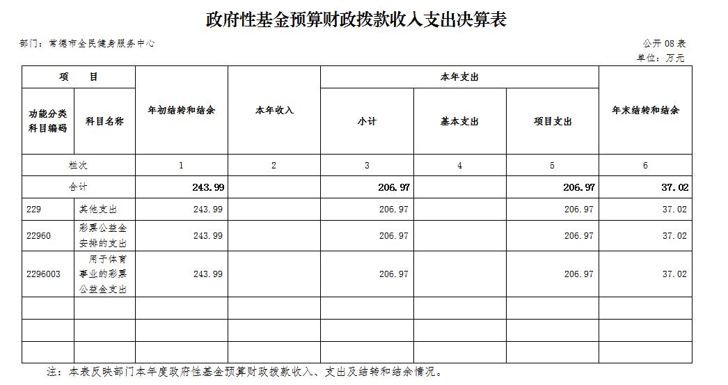 2021年度政府性基金预算财政拨款收入0万元;年初结转和结余243.99万元;支出206.97万元,其中基本支出0万元,项目支出206.97万元;年末结转和结余37.02万元。具体情况如下: