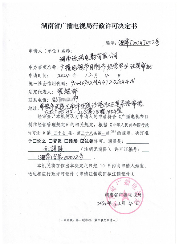 湖南省广播电视局行政许可决定书(湖南派诺电影有限公司)