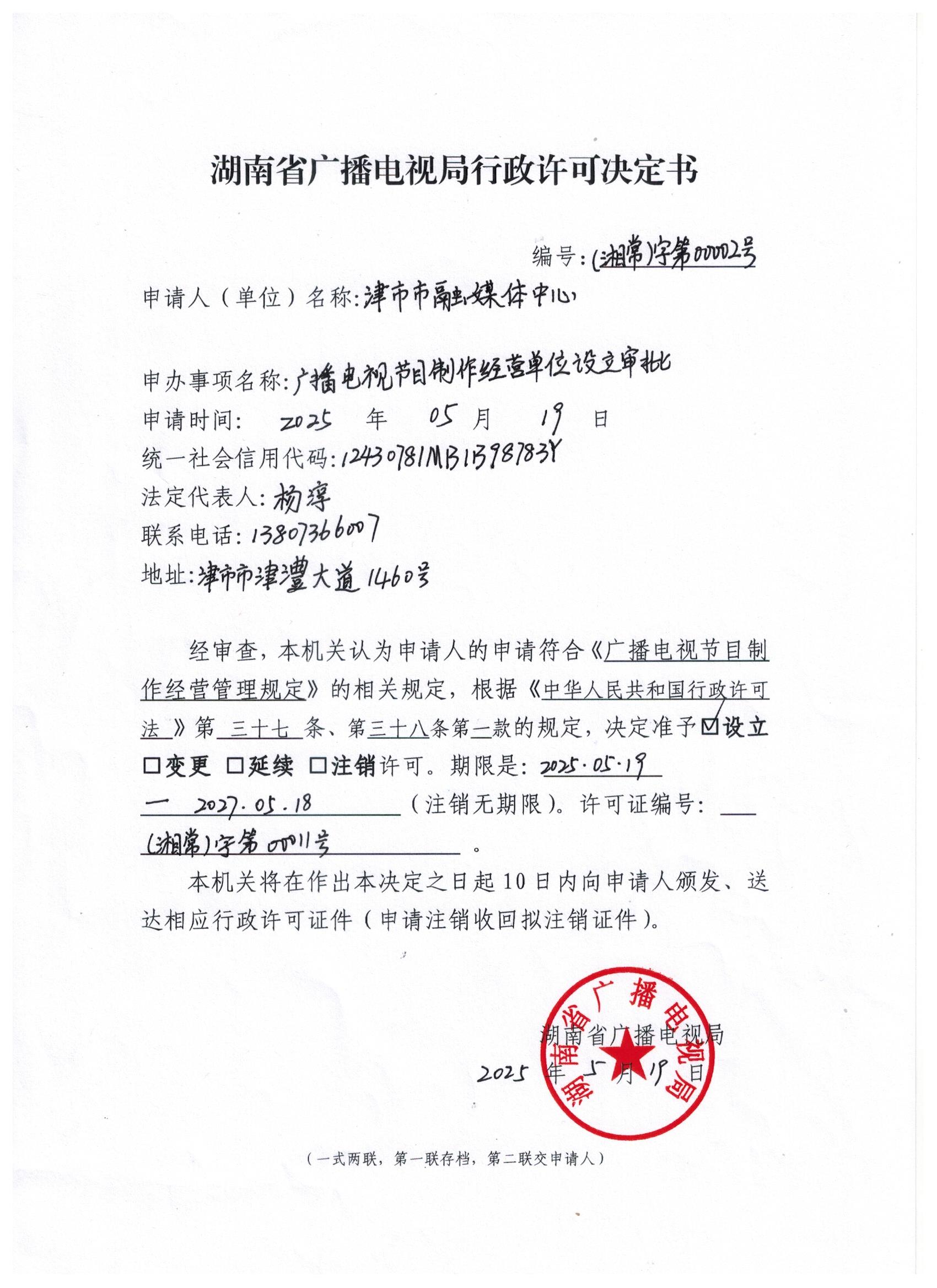 湖南省广播电视局行政许可决定书(津市市融媒体中心)