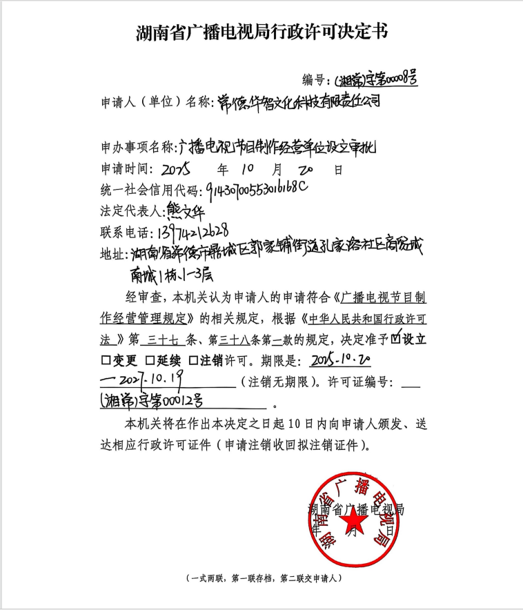 湖南省广播电视局行政许可决定书(常德华智文化科技有限责任公司)