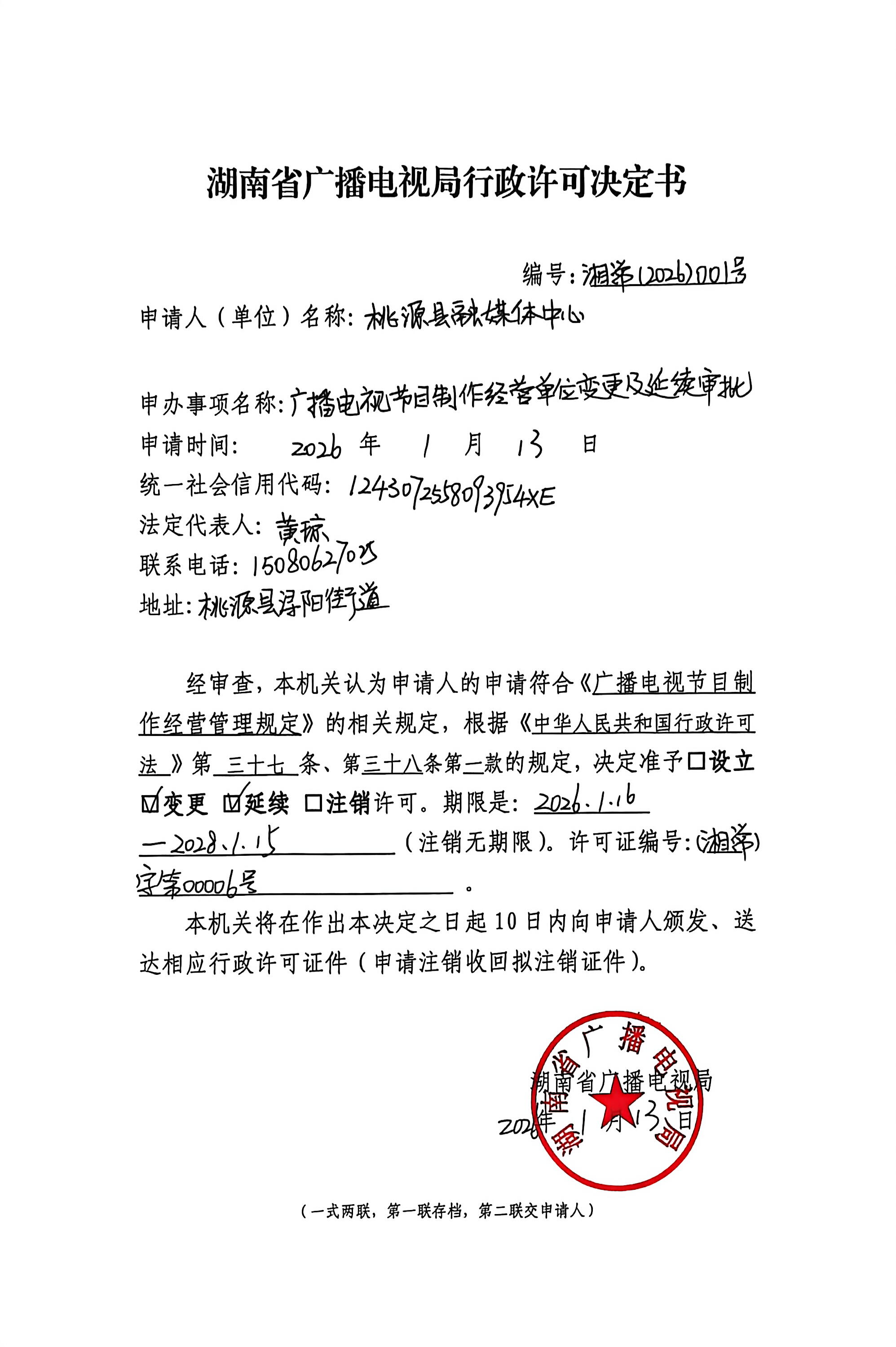 湖南省广播电视局行政许可决定书(桃源县融媒体中心 湘常【2026】001号)